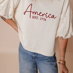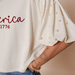 AMERICA EST 1776 Embroidered Pearl Beaded Sleeve T Shirt