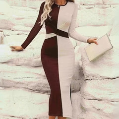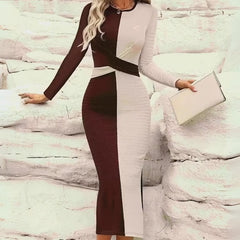 Two Tone Slit Round Neck Long Sleeve Midi Dress