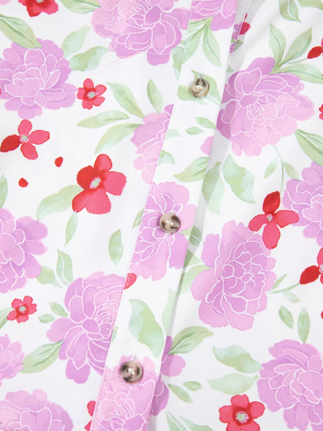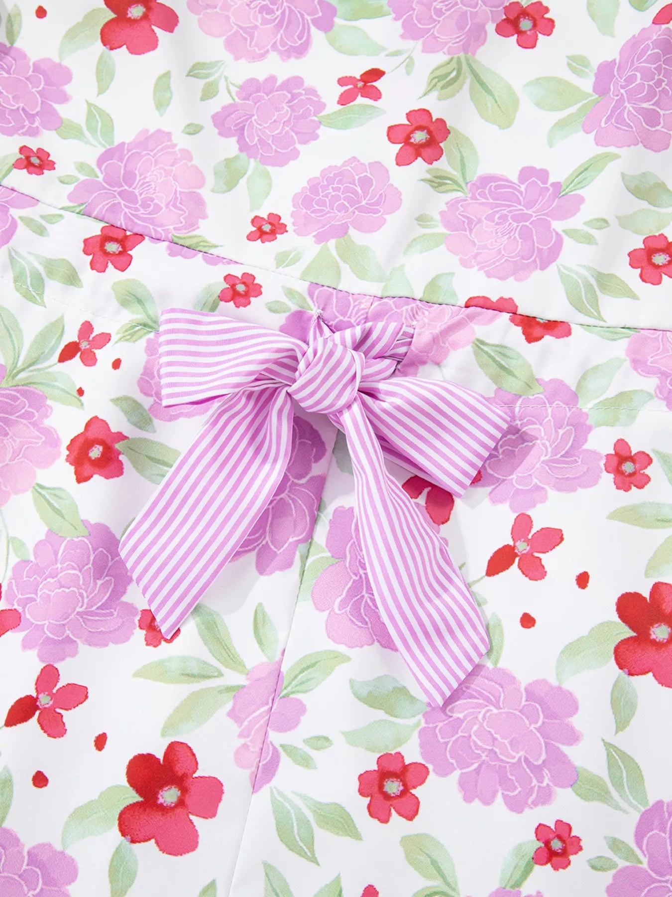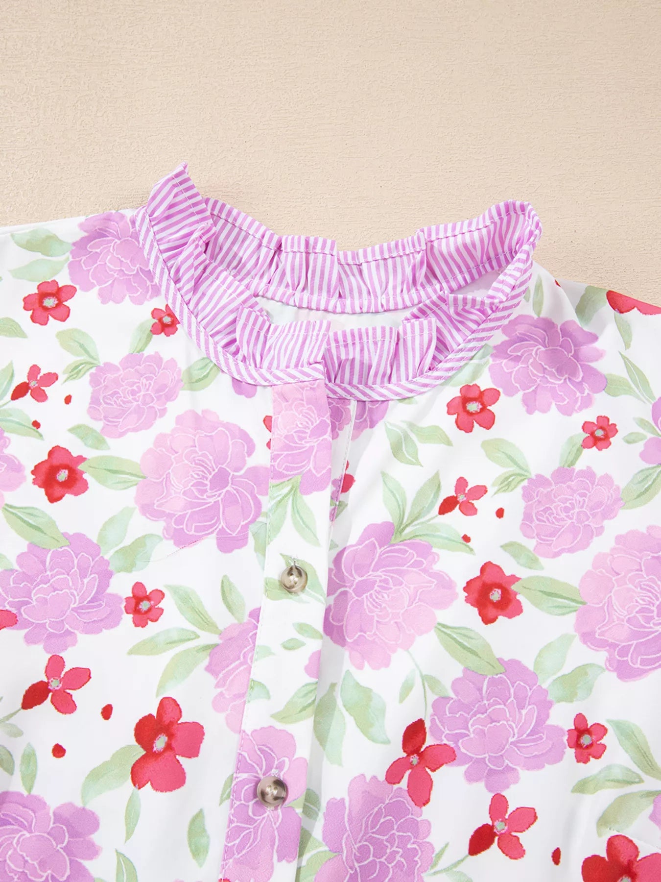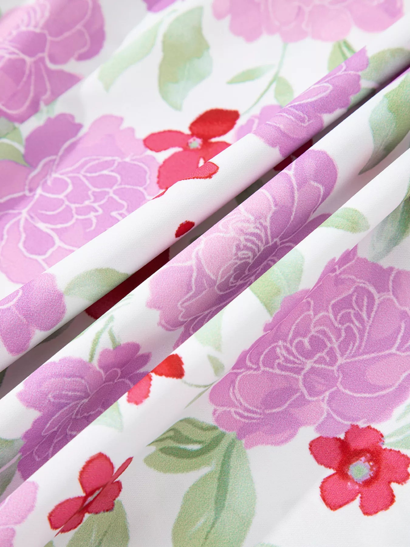 Floral Print Striped Trim Frilled Neck 3/4 Sleeve Flared Mini Dress