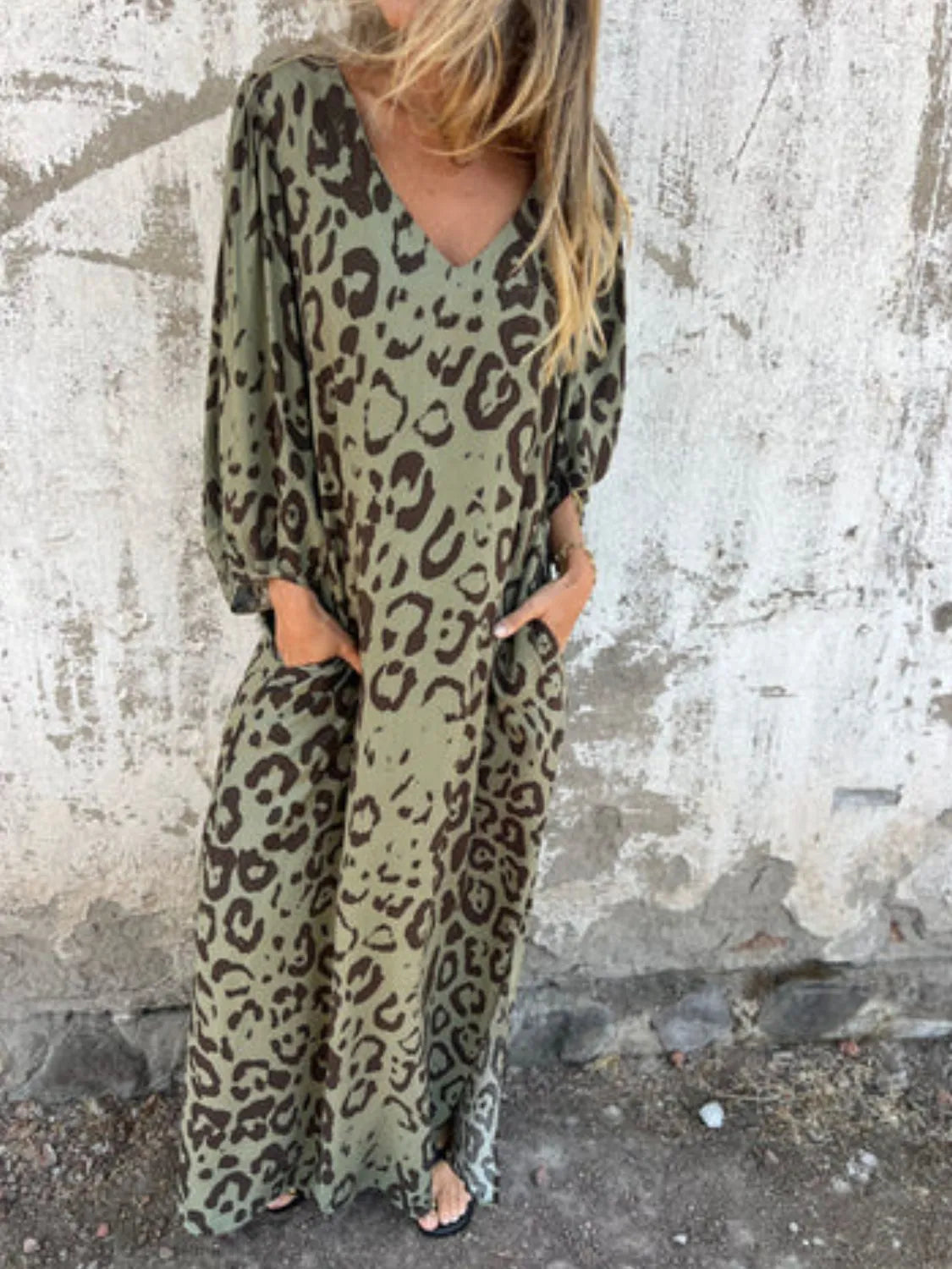 Full Size Printed V-Neck Dress with Pockets Plus Size