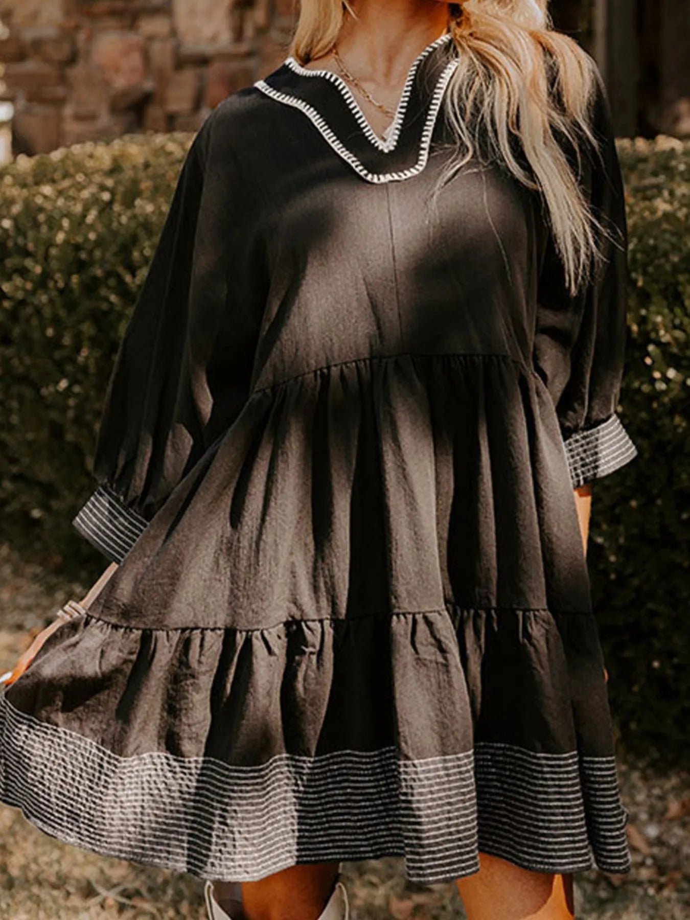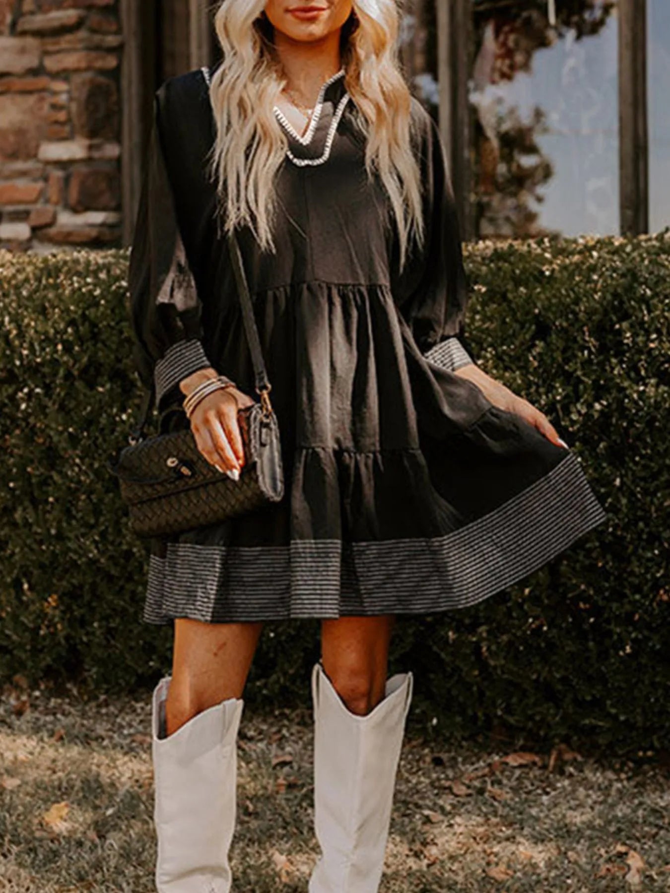Embroidered Polka Dot Tie Neck Long Sleeve Midi Dress