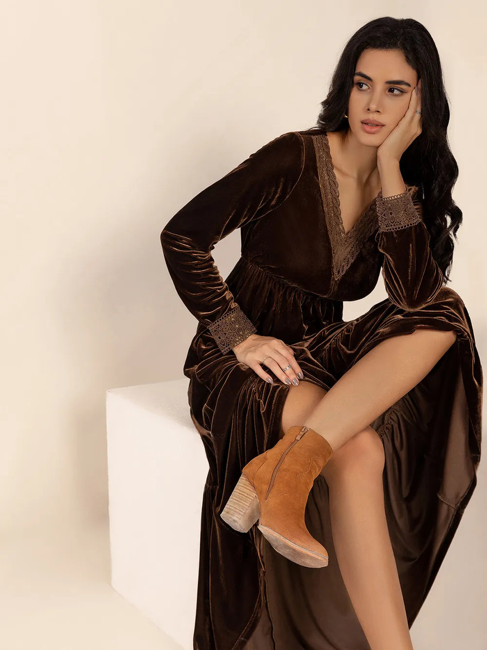 Lace Detail V-Neck Long Sleeve Maxi Dress