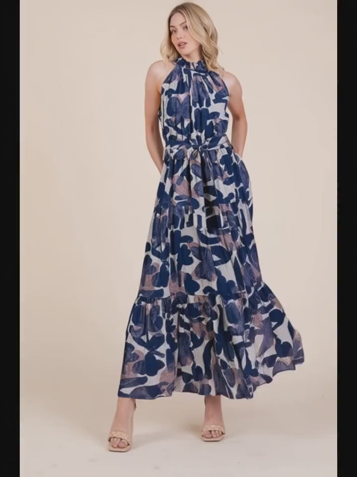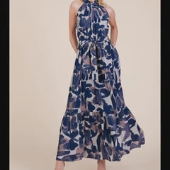 Lime 'N' Chili Abstract Halter Neck Tie-Waist Tiered Maxi Dress
