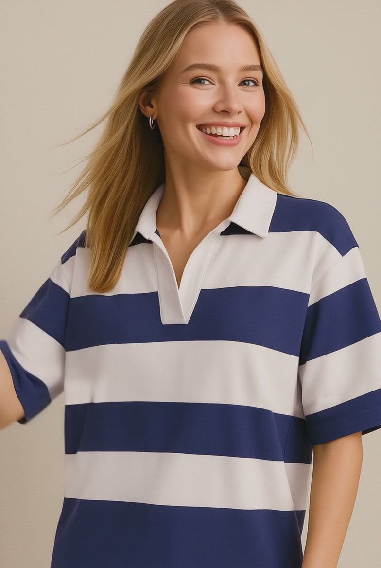 Oh Pima Cotton Wash Color Block Johnny Collar Half Sleeve Top