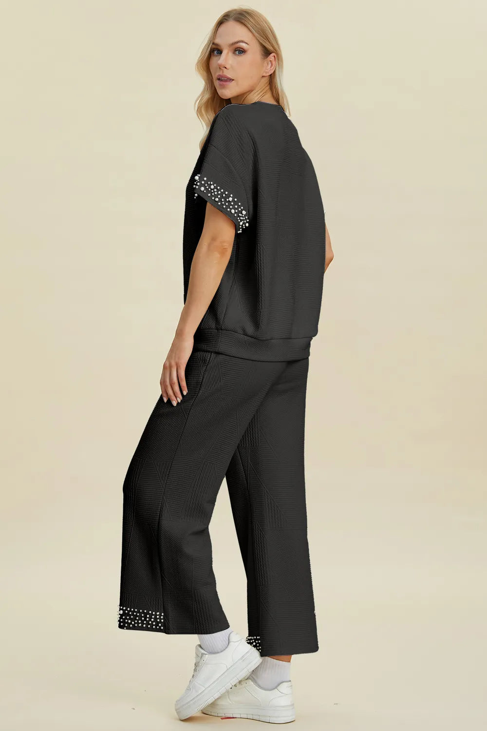 Double Take Full Size Pearl Detail Round Neck Top and Pants Set
