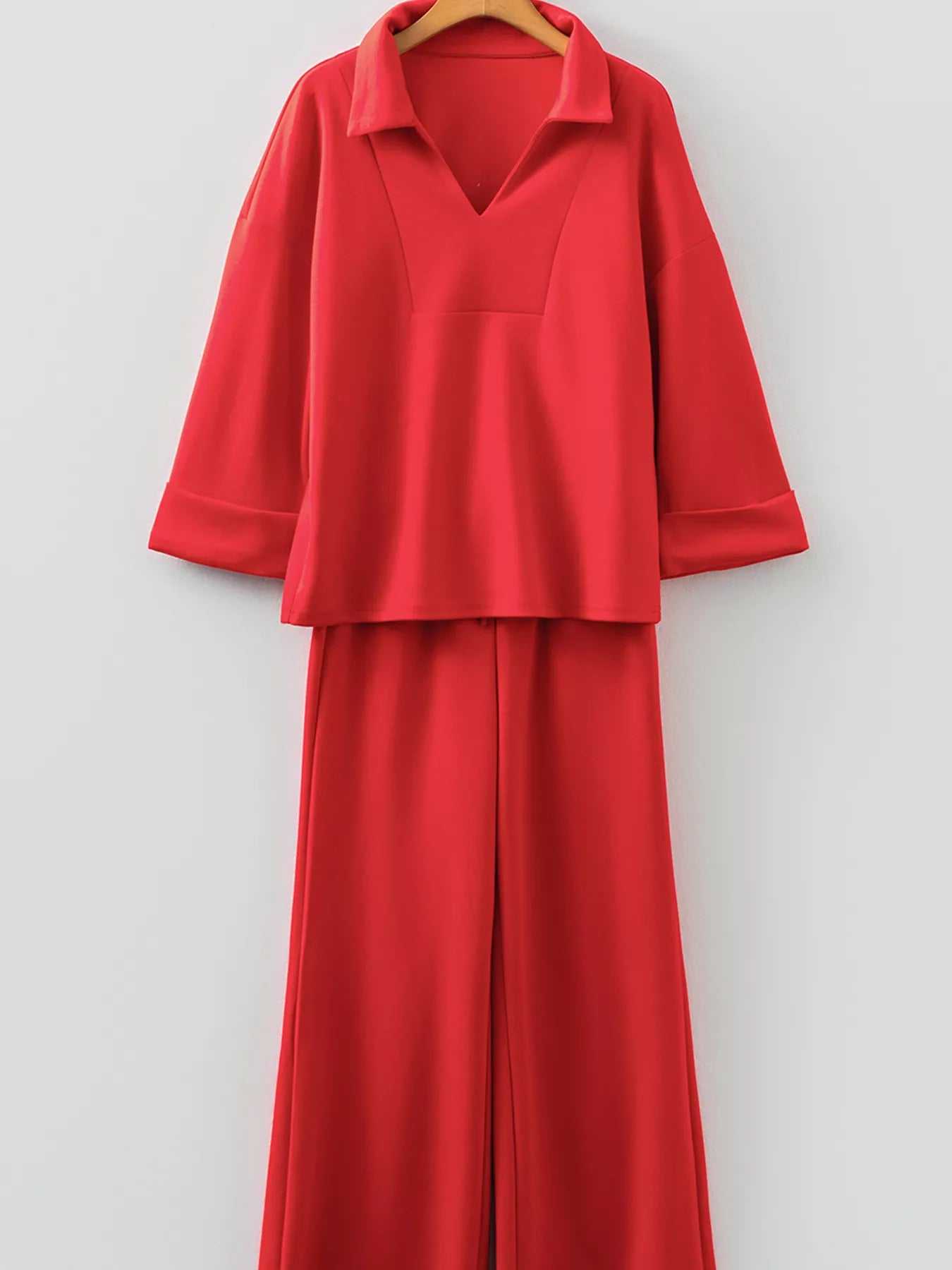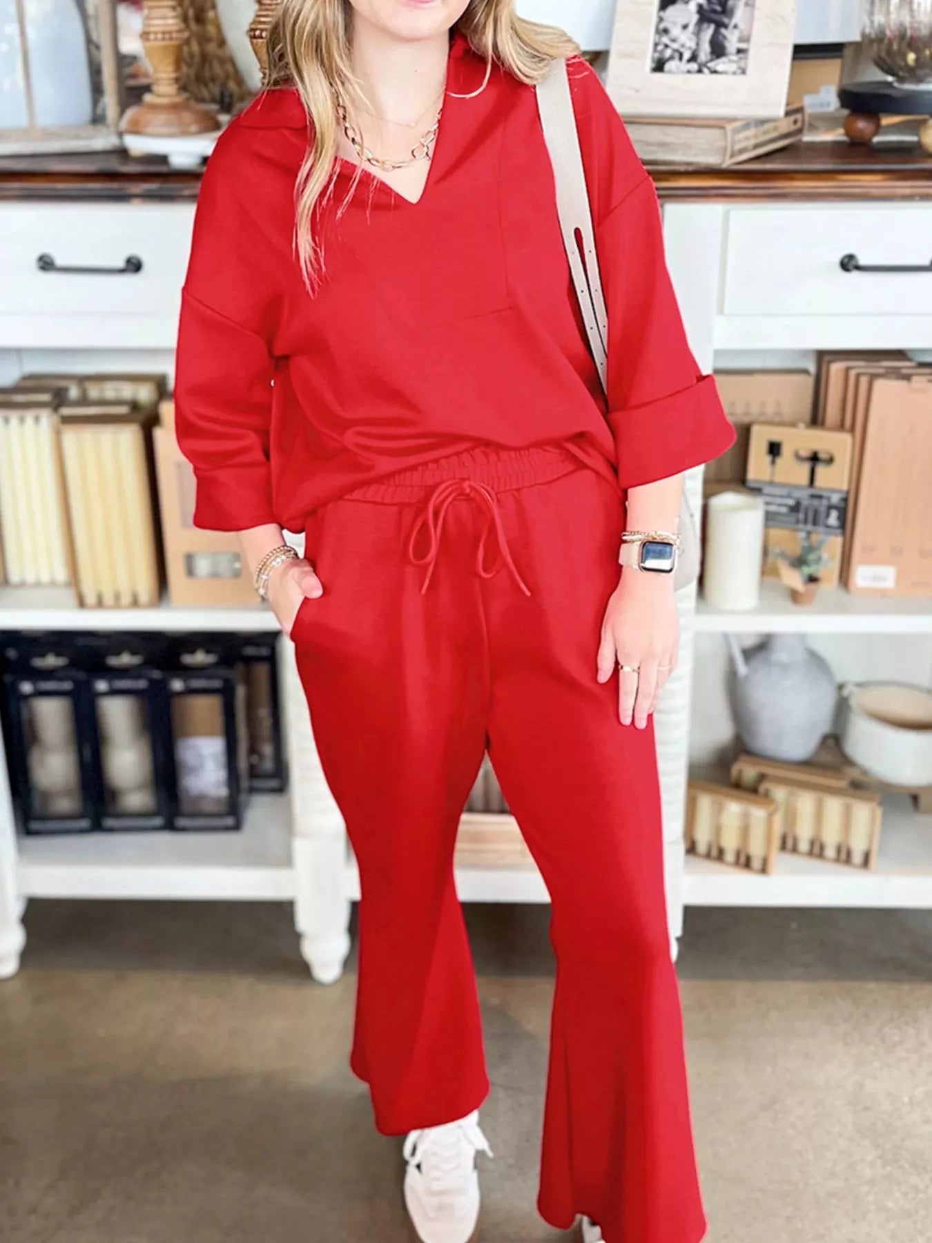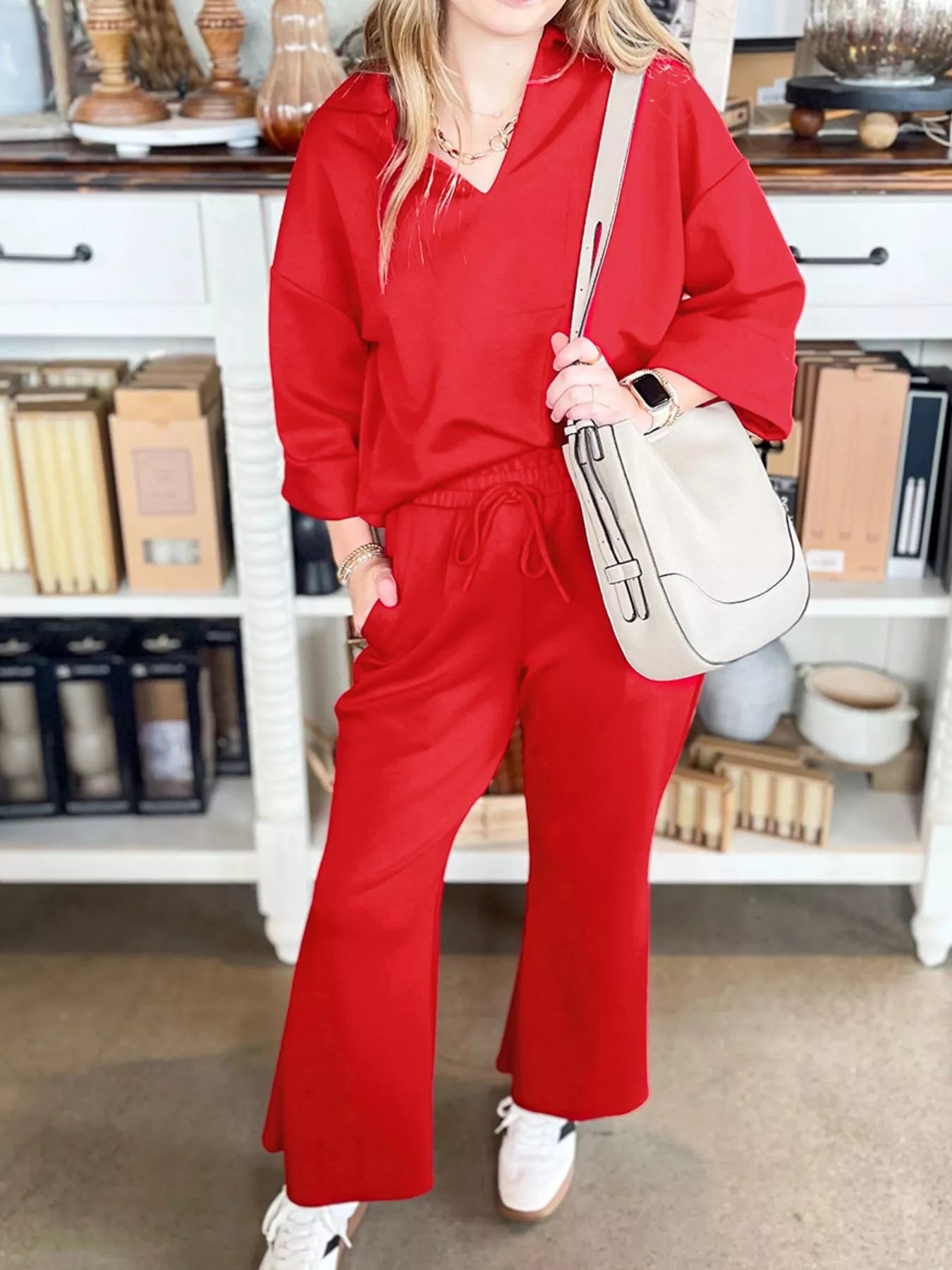 Polo Collar V Neck 3/4 Sleeve Pullover Drawstring Bell Bottom Pants 2pcs Set