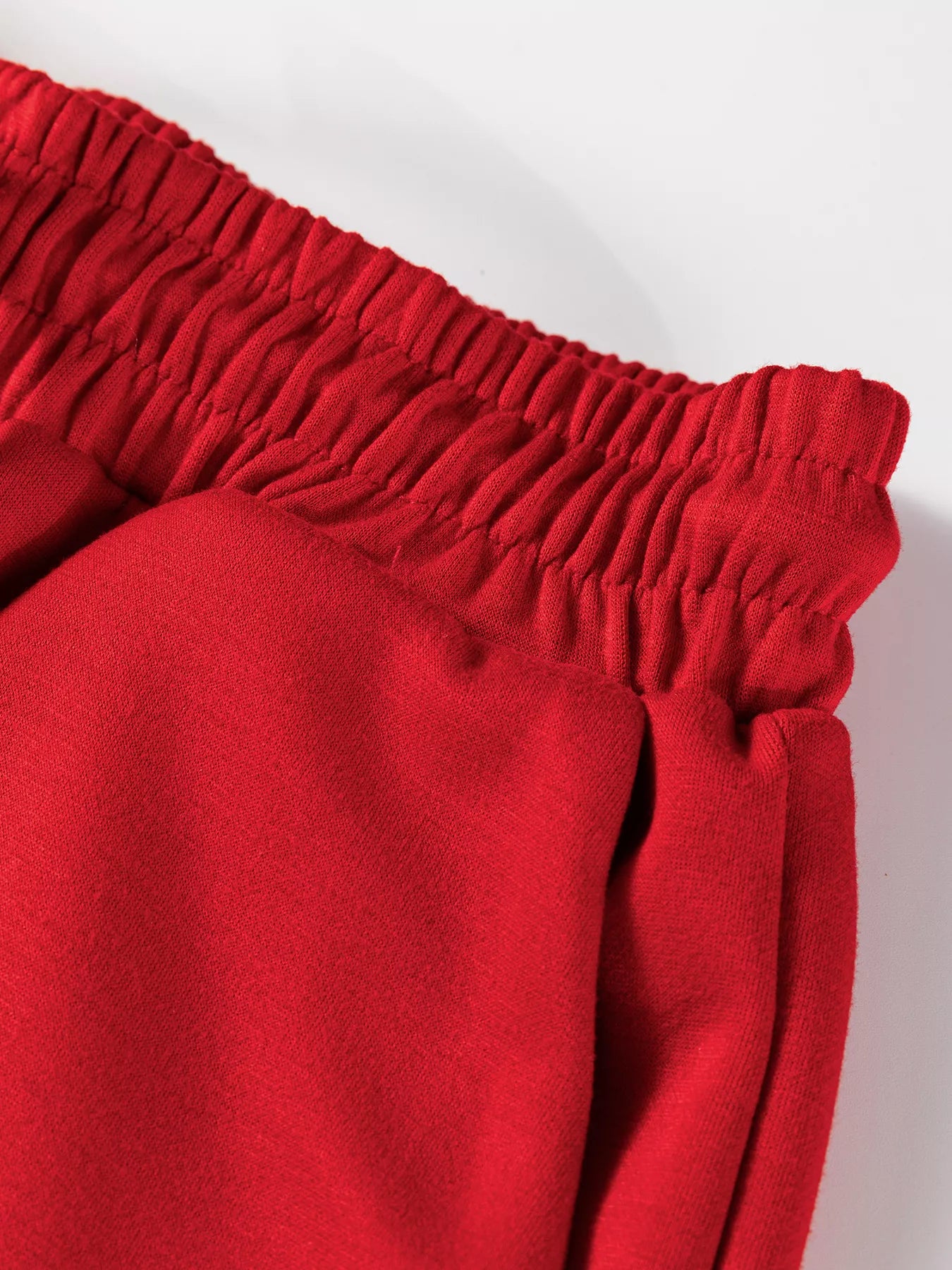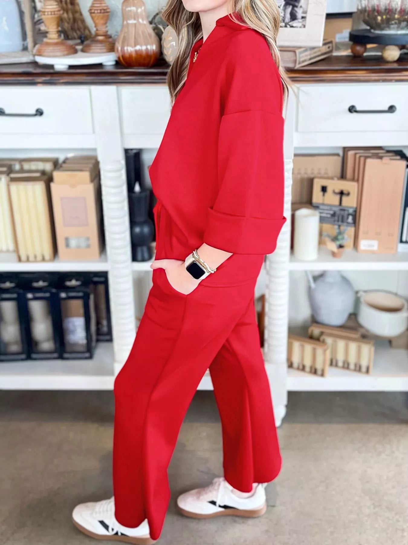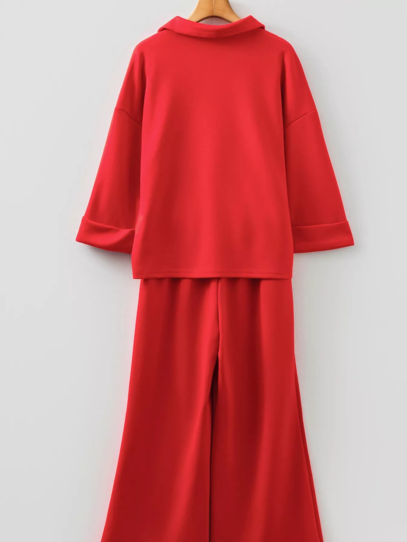 Polo Collar V Neck 3/4 Sleeve Pullover Drawstring Bell Bottom Pants 2pcs Set