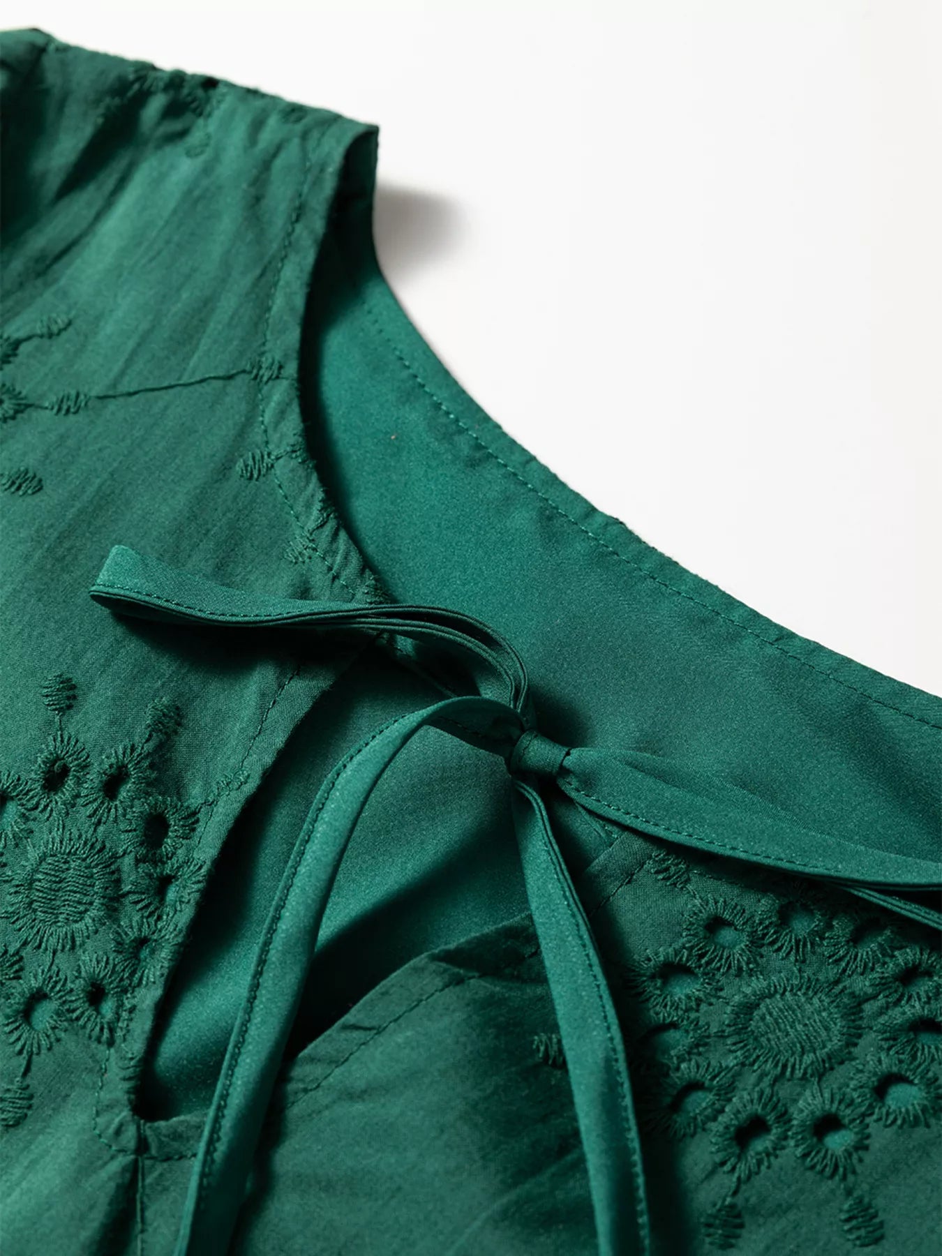 Embroidered Polka Dot Tie Neck Long Sleeve Midi Dress