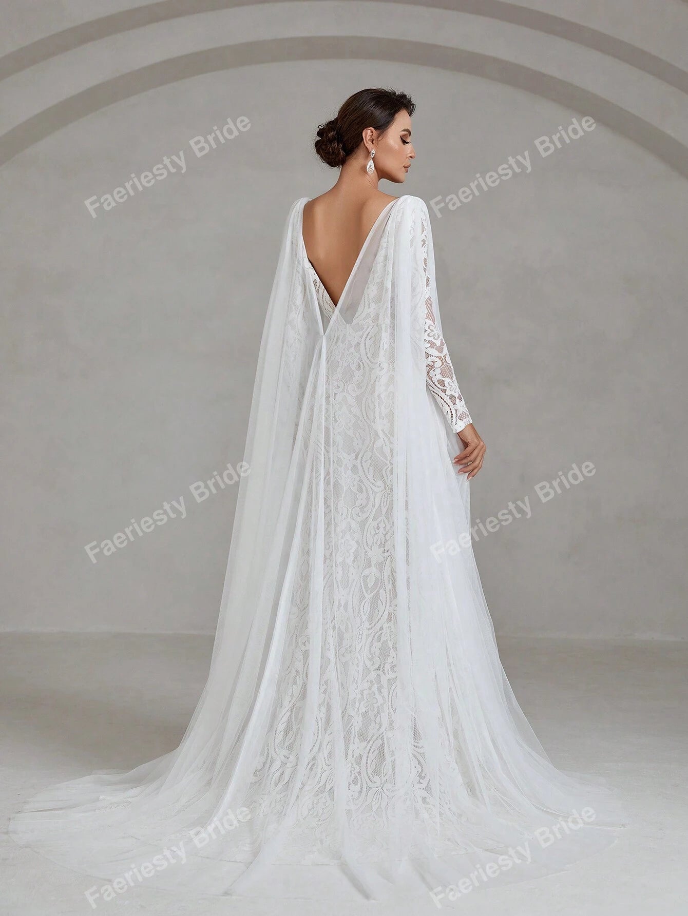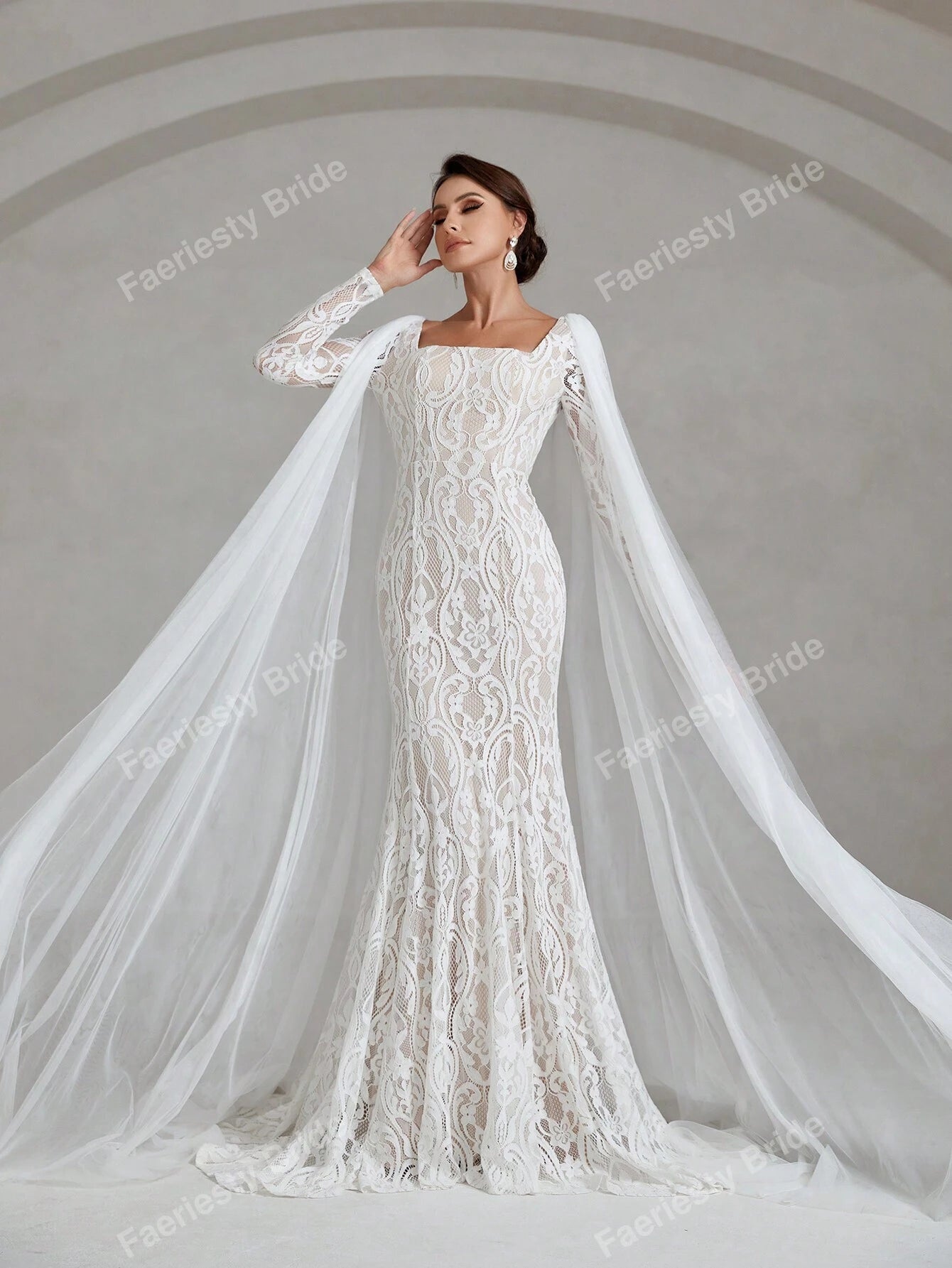 Faeriesty Elegant Square Neckline Long-Sleeve Mermaid Wedding Dress Bridal Gown with Sheer Organza Cape Detailing – Perfect for Church Ceremonies, Formal Galas, Destination Weddings, Luxurious Evening Receptions, and Grand Cathedral Celebrations