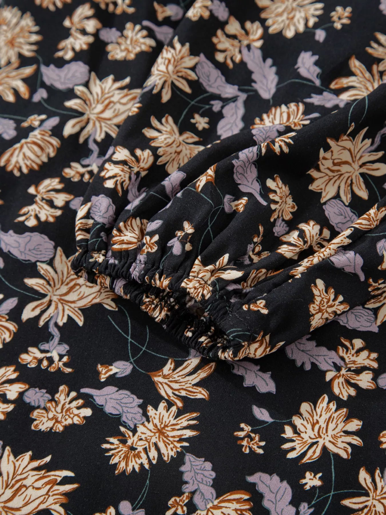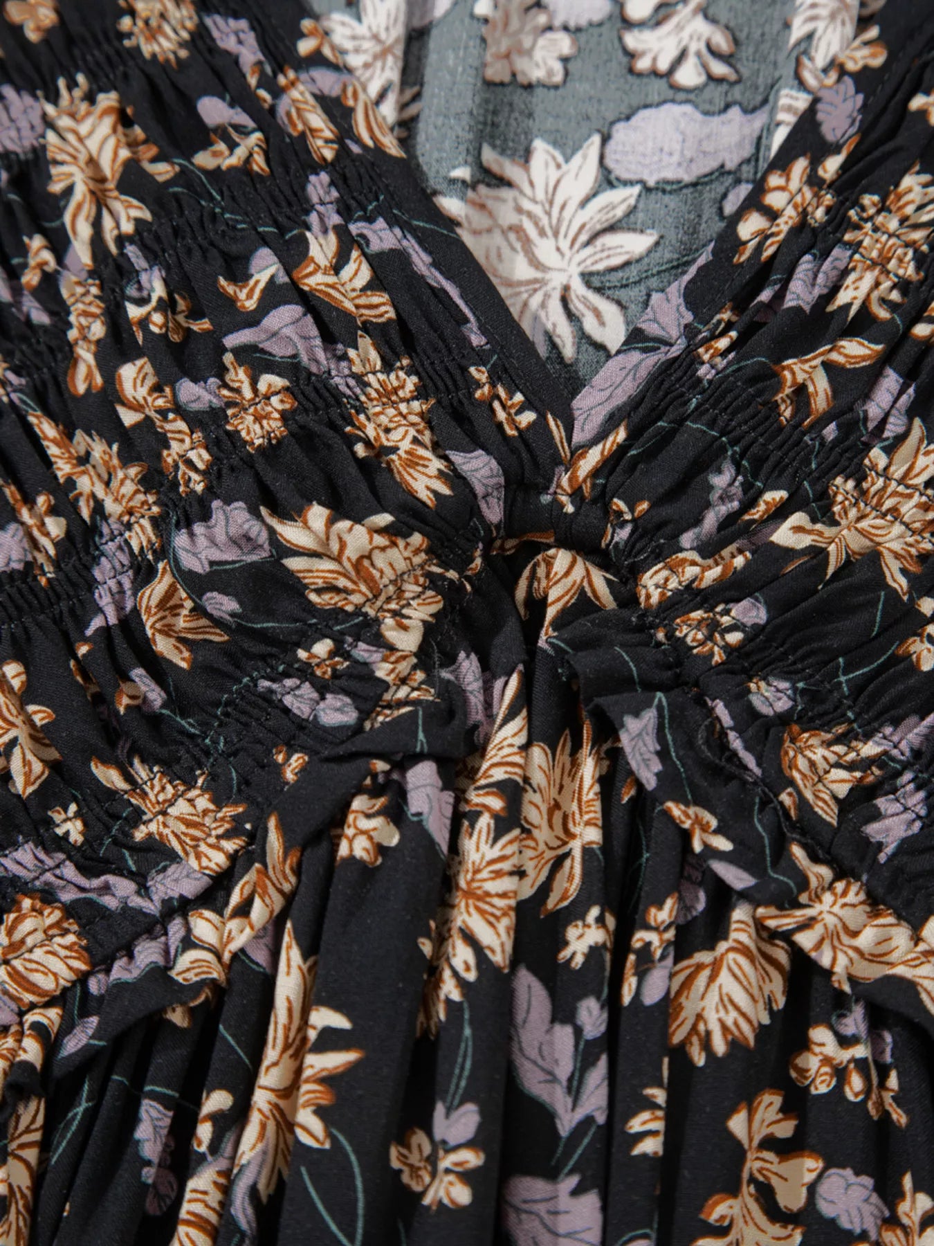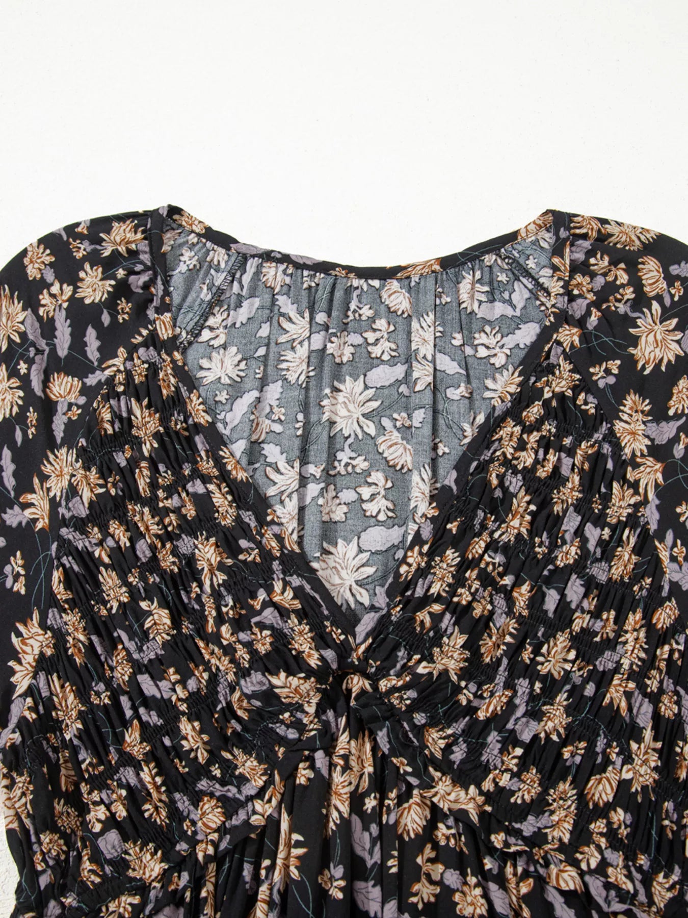 Floral Deep V Neck Smocked Bust Bubble Sleeve Babydoll Dress