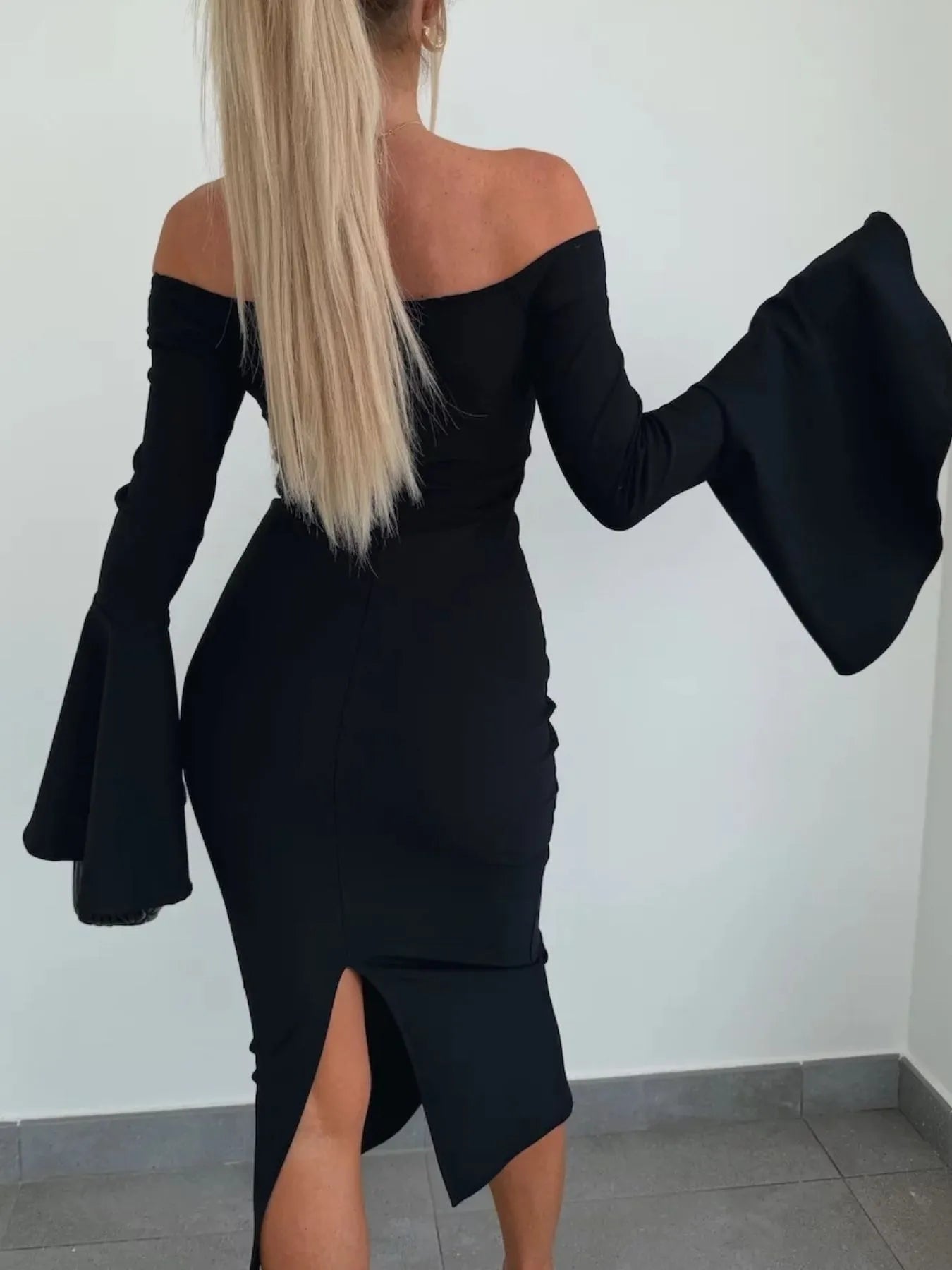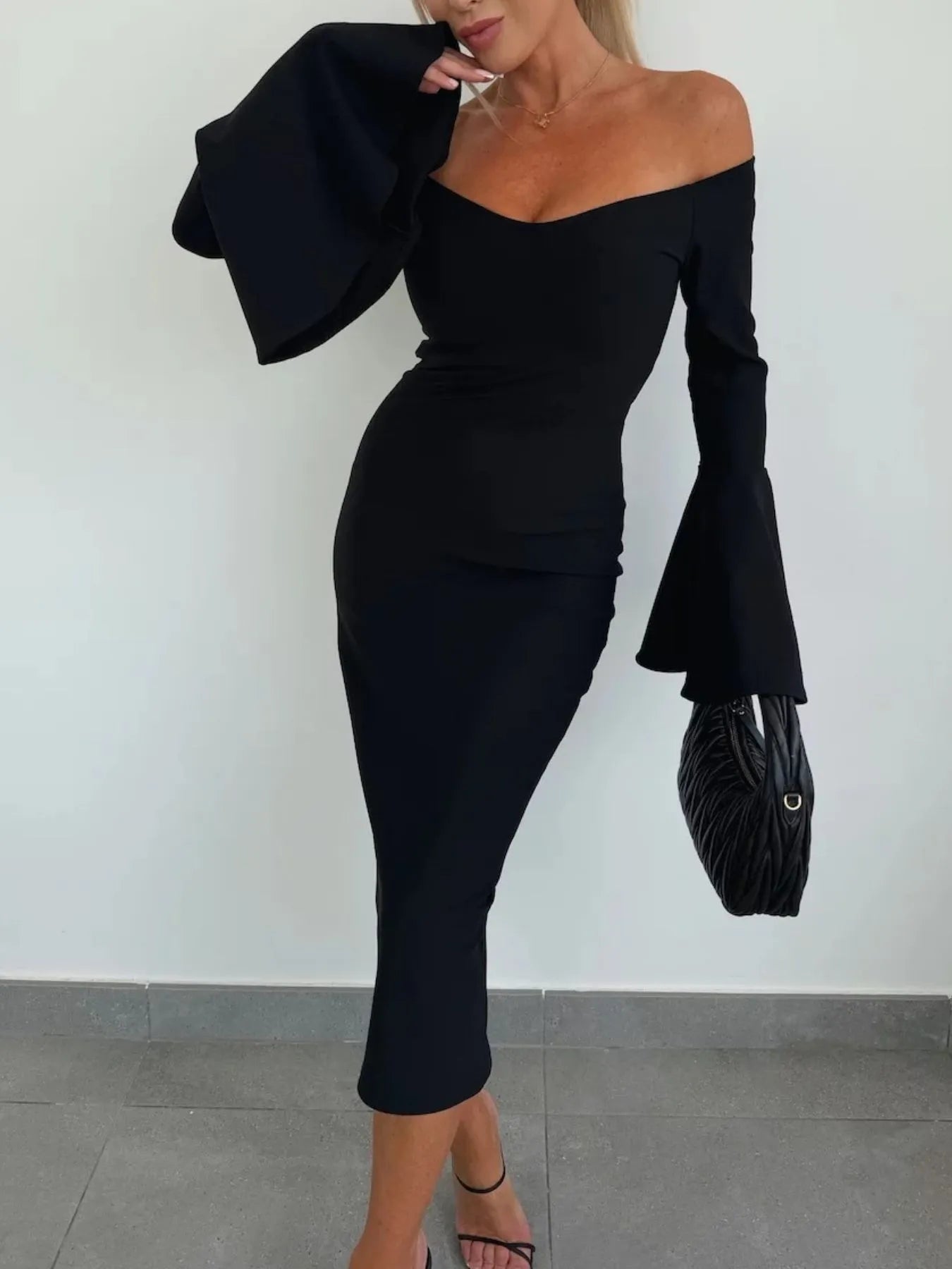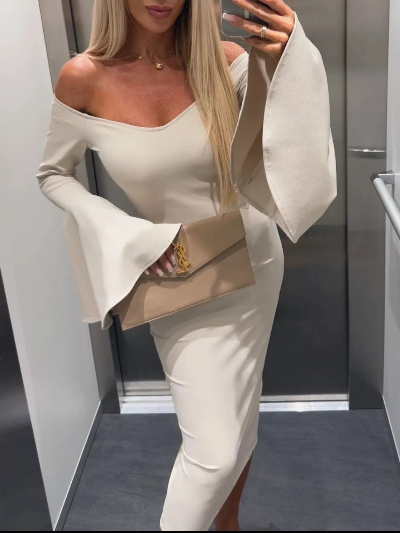 Off Shoulder Bell Sleeve Bodycon Midi Dress