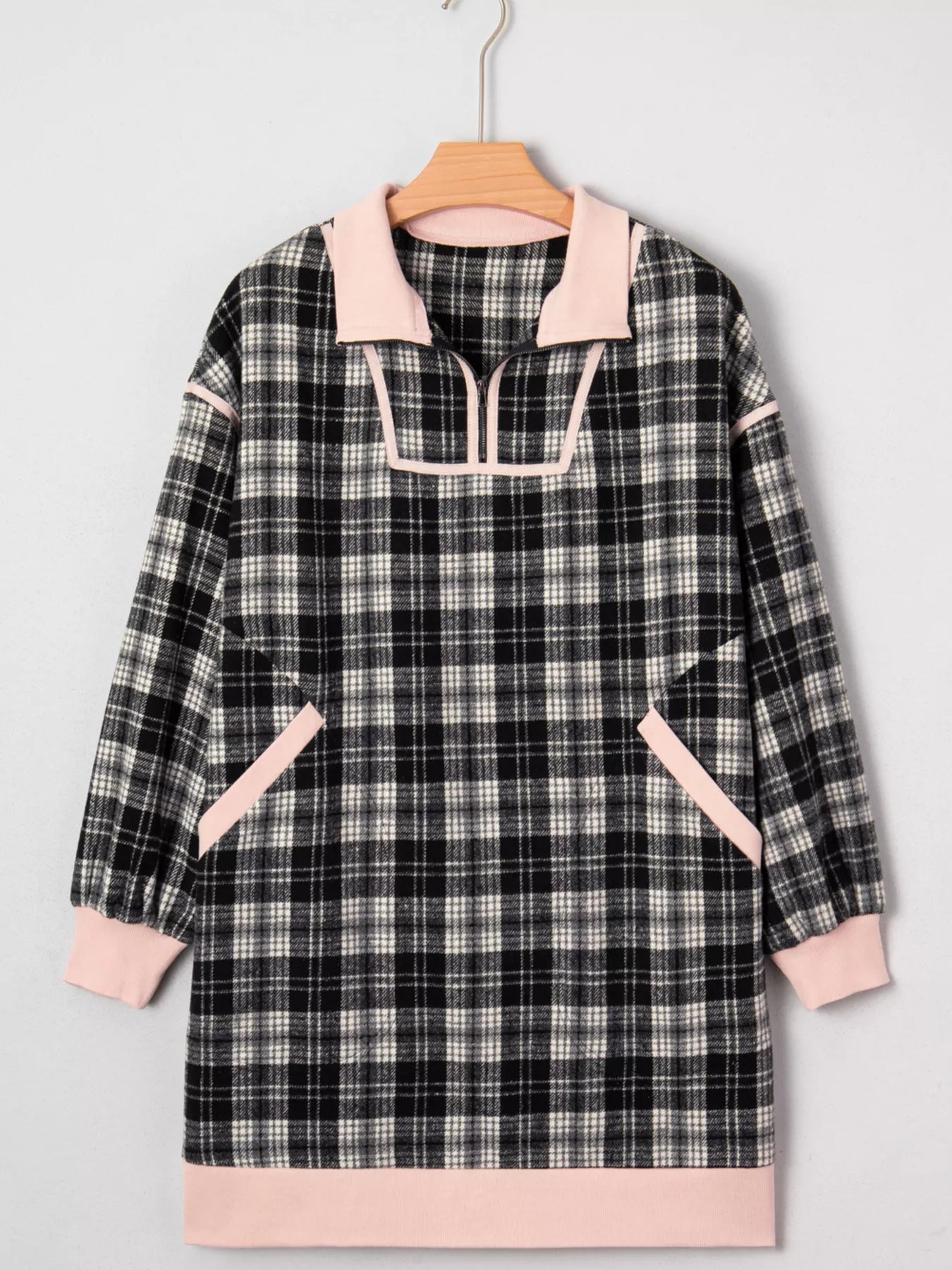 Plaid Polo Collar Zip up Contrast Trim Shift Long Sleeve Mini Dress